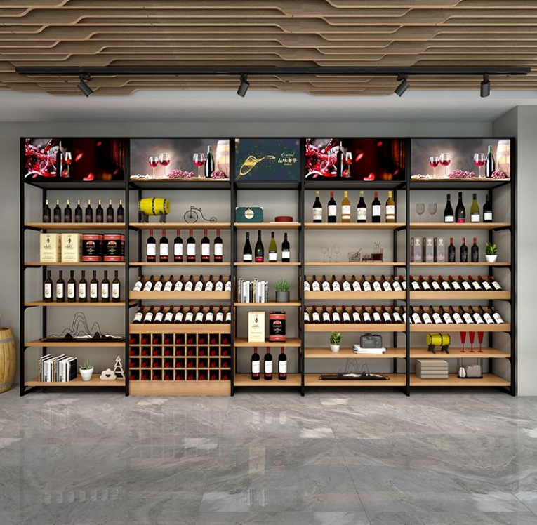 产品简介:红酒货架是上海超市货架的一种。本款红酒专用货架,结合红酒的特殊性以及客户的购物习惯,采用钢木相结合的方式设计而成。本款货架是双面加端头,在双面设计为三层展示层,在下面一层以下设计菱形方格,可以用来展示也可用来备货储存;在端头,设计两层展示层,用于展示红酒,两层以下设计添加多个规格不等小木箱,错乱放置,这样看起来既时尚又美观。
